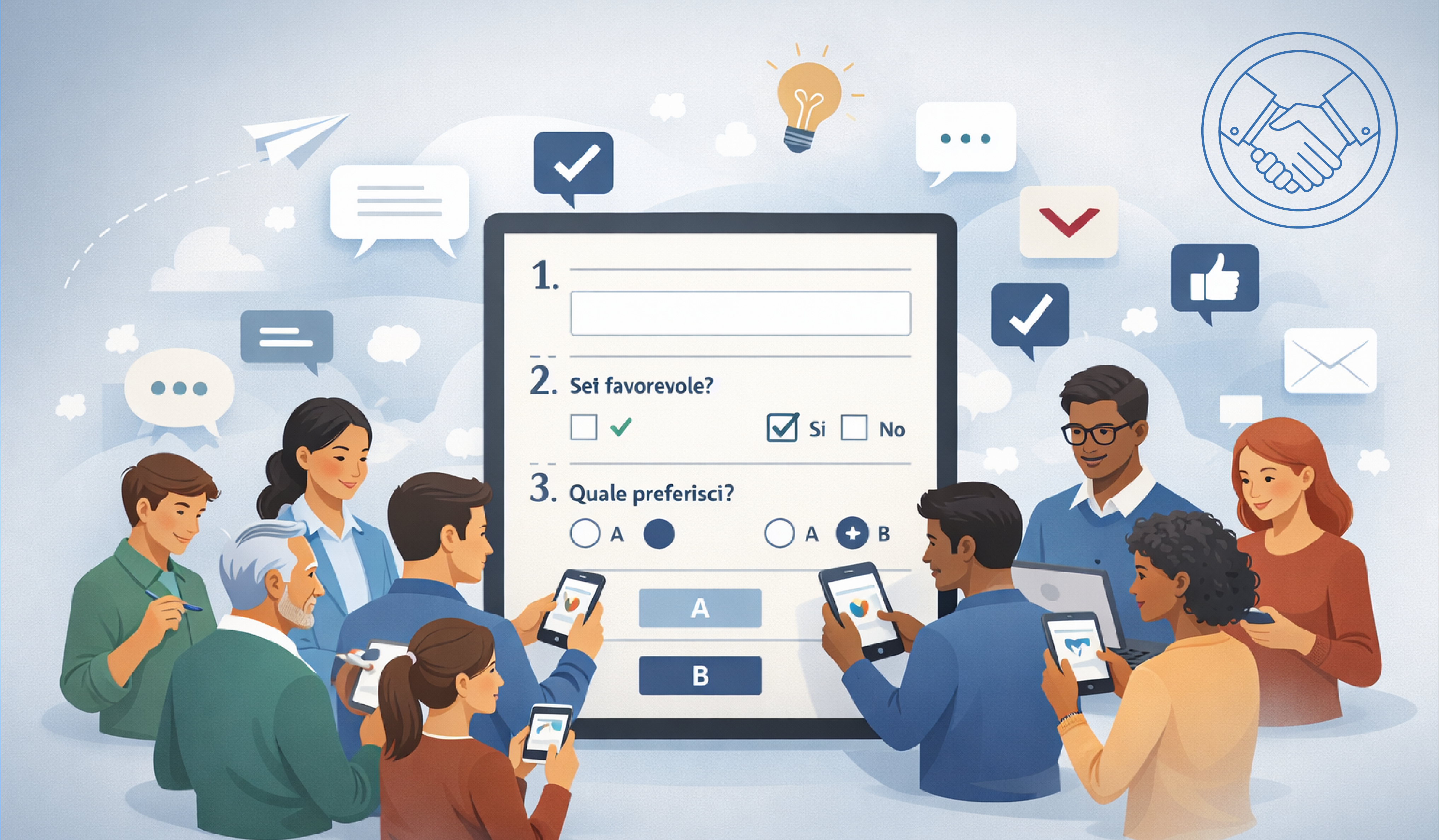 La consultazione avviene tramite questionari distinti per categoria e tre incontri dedicati. Ogni questionario consente risposte aperte e la presentazione libera di proposte e osservazioni mirate agli obiettivi indicati.